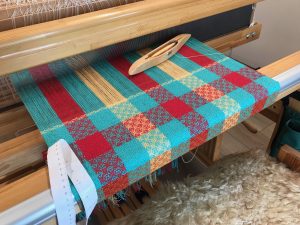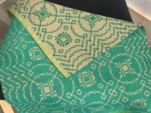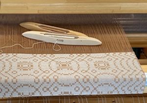 Table linens in a two-sided weave called “Summer and Winter”. One light side, one dark side. This particular, circular pattern is from the 1800’s.